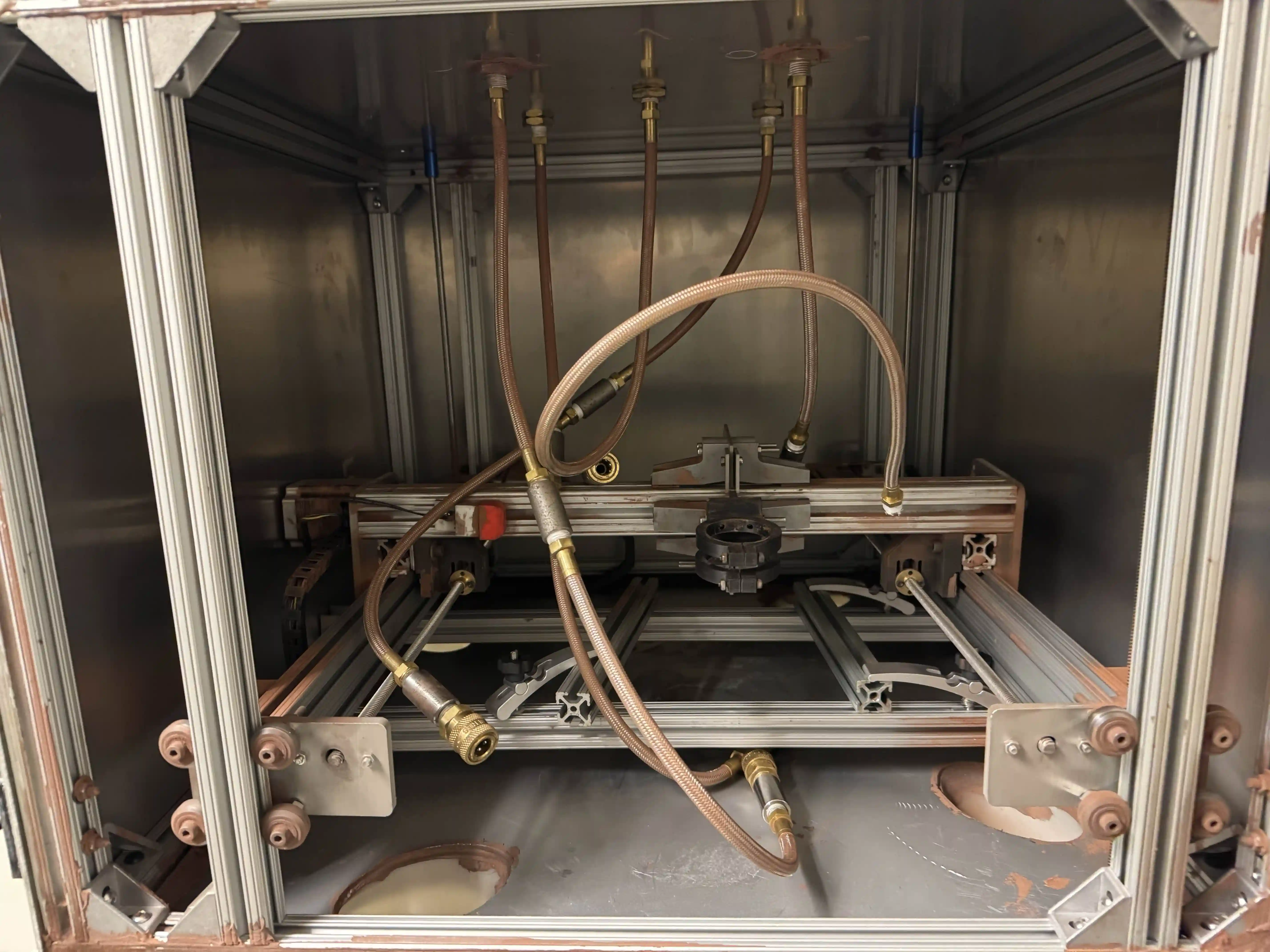 Dozens of firmware iterations were written, all based on Marlin. The major difficulty was in getting the firmware operational with a unique dual Y axis and quad Z axis, and creating comaptibility with a system that did not have classical 3D printing elements. A final configuration was written for this custom movement system.