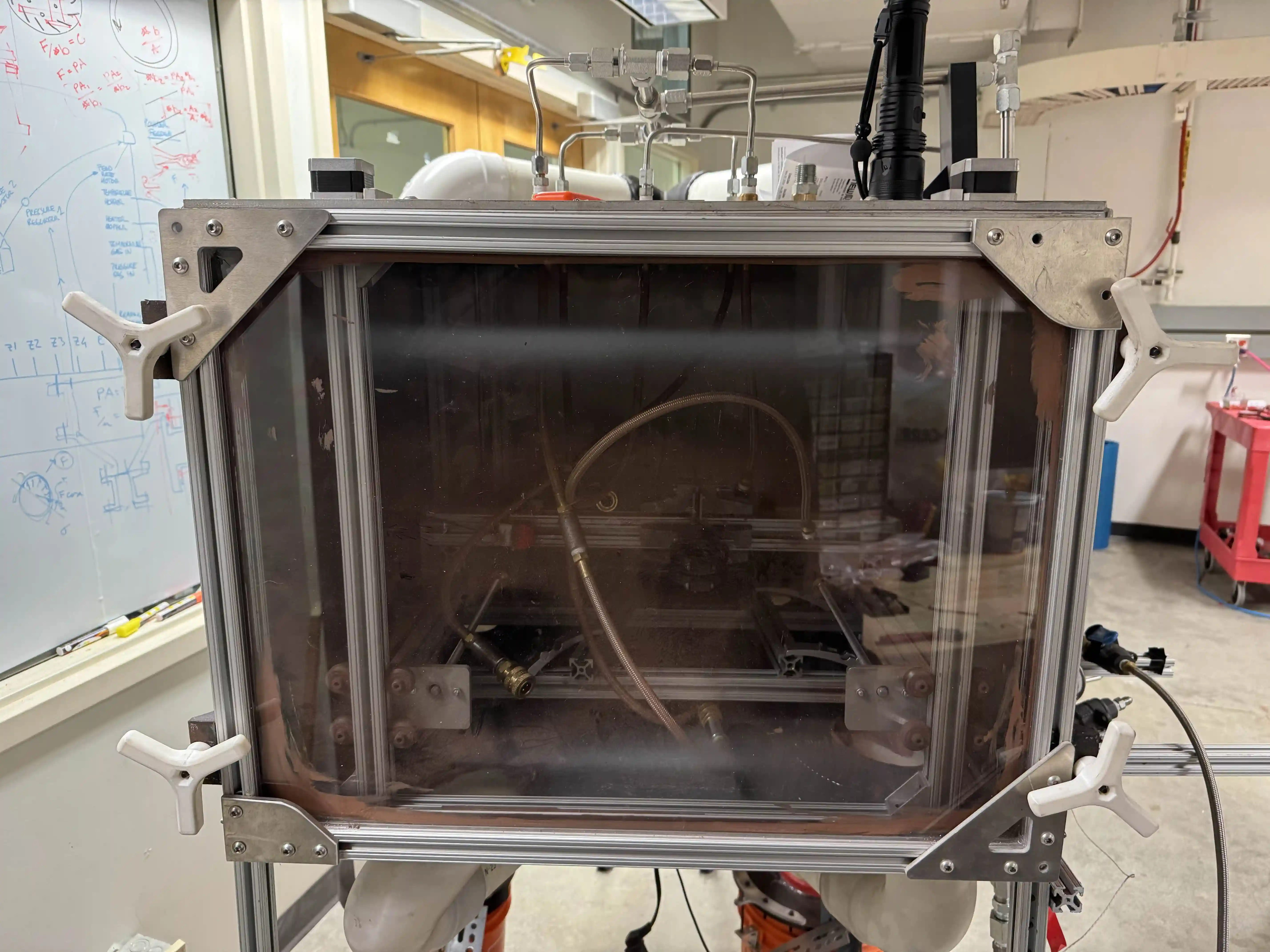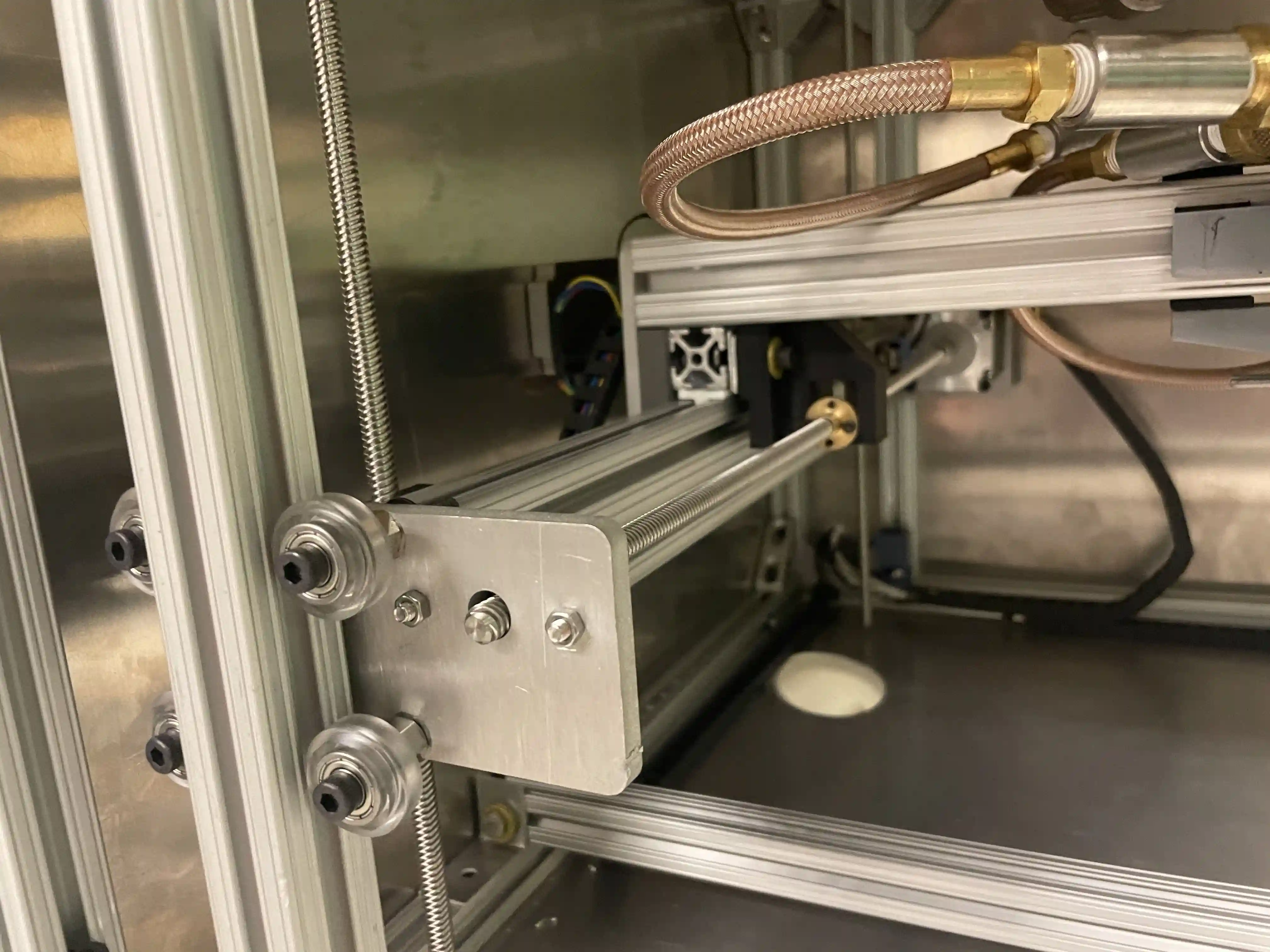 All moving parts and electronics were sealed against the environment or chosen to be compatible. For example, PTFE slides were used instead of ball bearings, and POM nuts instead of ball screws.